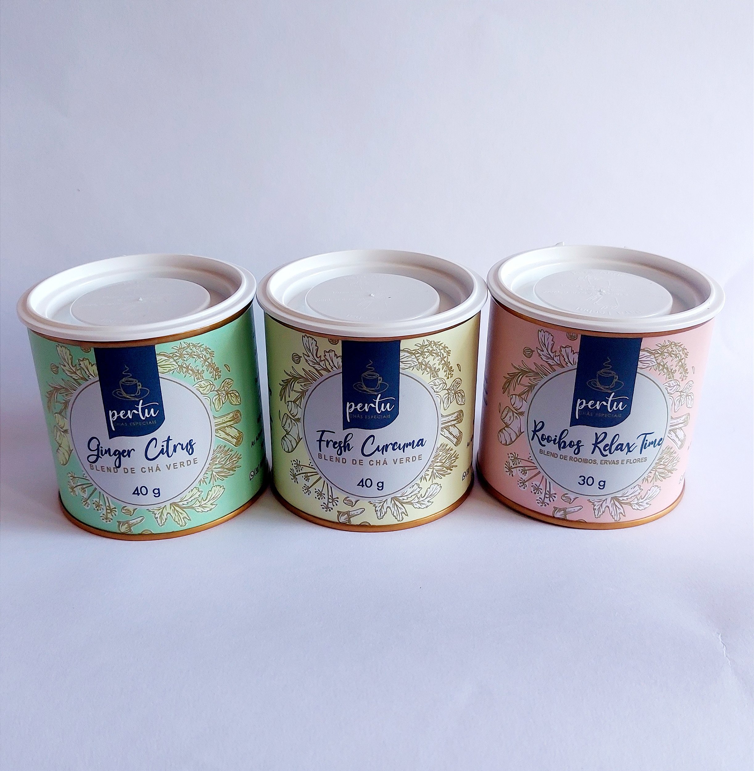 Contém 1 lata de 30g Rooibos relax time, 1 lata de 40g de Ginger Citrus e 1 lata de 40g do Fresh curcuma.